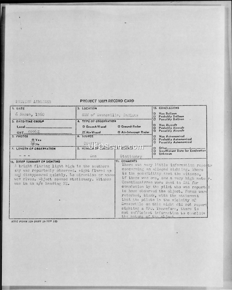 An unidentified aerial phenomenon was reported by an Eastern Airlines pilot on 6 March 1960 near Evansville, Indiana. Eastern Airlines subsequently denied the existence of the flight and the report, leading the Air Force to conclude there was insufficient data.