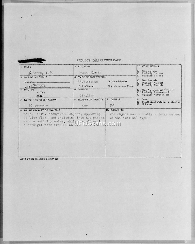 On 14 March 1960, multiple witnesses in Nome, Alaska, reported a bright, exploding object in the sky. The Air Force investigation concluded the object was a large meteor of the 'bolide' type.