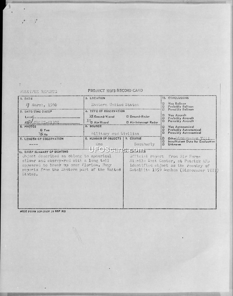 This document collection contains reports and correspondence regarding a series of sightings of unidentified aerial phenomena that occurred on the evening of March 7, 1960, across the Eastern United States. Witnesses, including civilian pilots and military personnel, reported seeing a formation of bright, fast-moving objects with long tails, described variously as silver, cherry-red, or light orange. The sightings were reported from locations ranging from Maine to Florida and as far west as Ohio. The Air Technical Intelligence Center (ATIC) and other military commands, including the North American Air Defense Command (NORAD), coordinated to investigate these reports. The official conclusion reached by the Air Force was that the sightings were caused by the re-entry and subsequent breakup of the Discoverer VIII satellite. The documents include a Project 10073 record card, internal Air Force memos, and transcripts of teletype messages from various military units, including Heavy Attack Squadron THREE and the Air Force Missile Test Center at Patrick Air Force Base. The reports consistently describe the objects as moving in a southerly direction and, in several instances, breaking apart. The military investigation determined that the timing and trajectory of the sightings coincided with the 1595th revolution of the Discoverer VIII satellite. Despite initial speculation by some observers that the lights might be a meteor shower or a missile, the official determination remained that the phenomena were the result of the satellite's re-entry into the atmosphere.