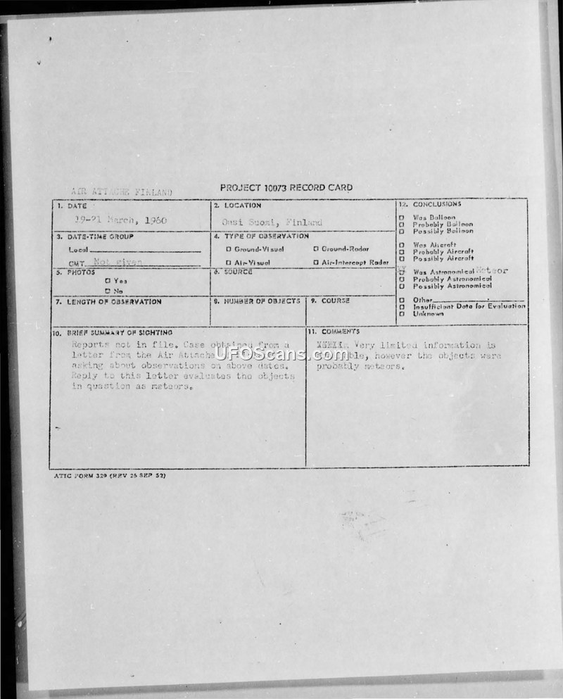 Project 10073 Record Card — Finland, March 1960