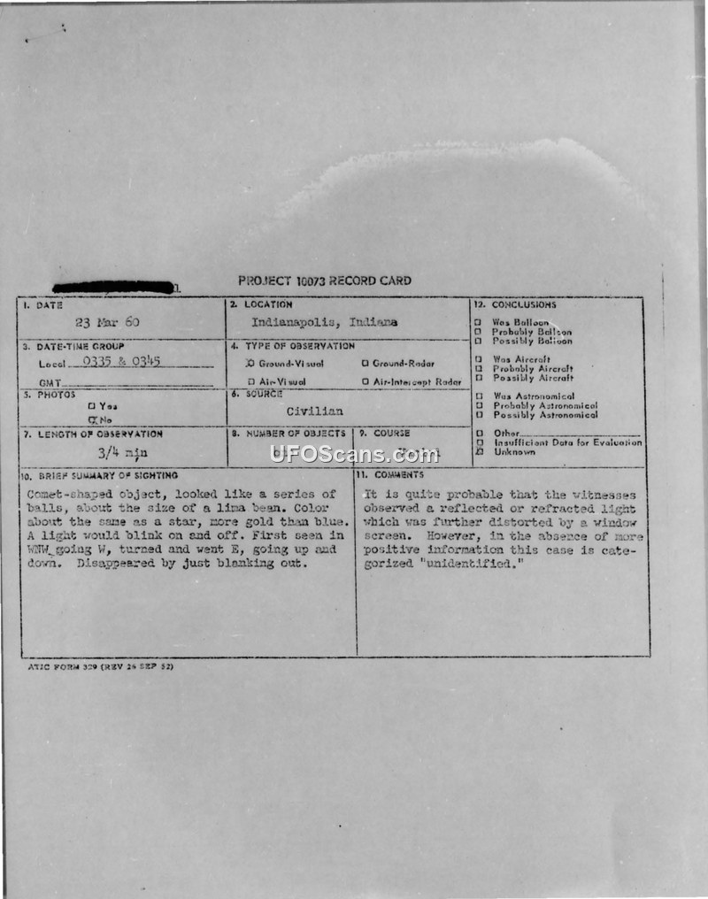 Project 10073 Record Card — Indianapolis, Indiana, 23 March 1960