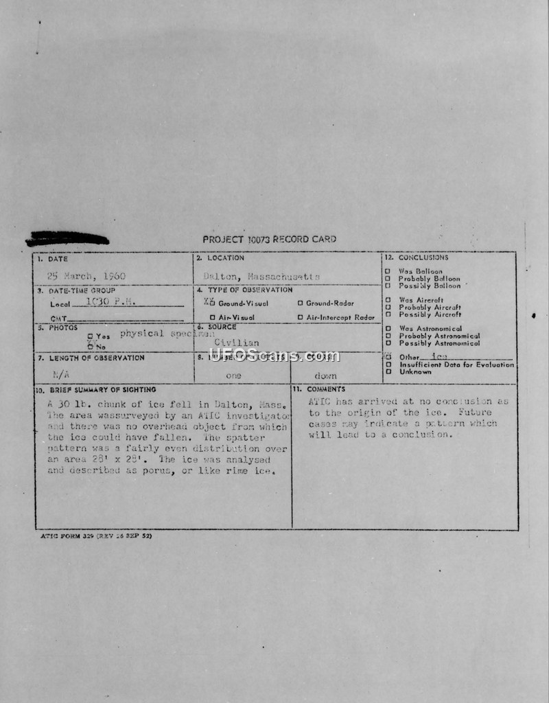 A 30-pound chunk of ice fell in Dalton, Massachusetts, in March 1960. ATIC and the Wright Air Development Division analyzed the sample, identifying it as porous ice containing silicon dioxide, but could not determine its origin.