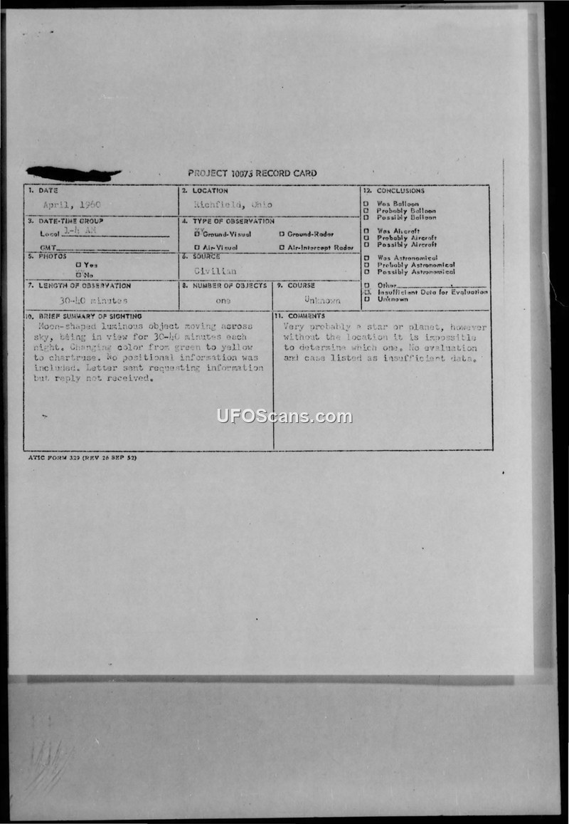 A Richfield, Ohio resident reported multiple sightings of a luminous, color-changing object in April 1960. The Air Force concluded the object was likely an astronomical body but classified the case as insufficient data.