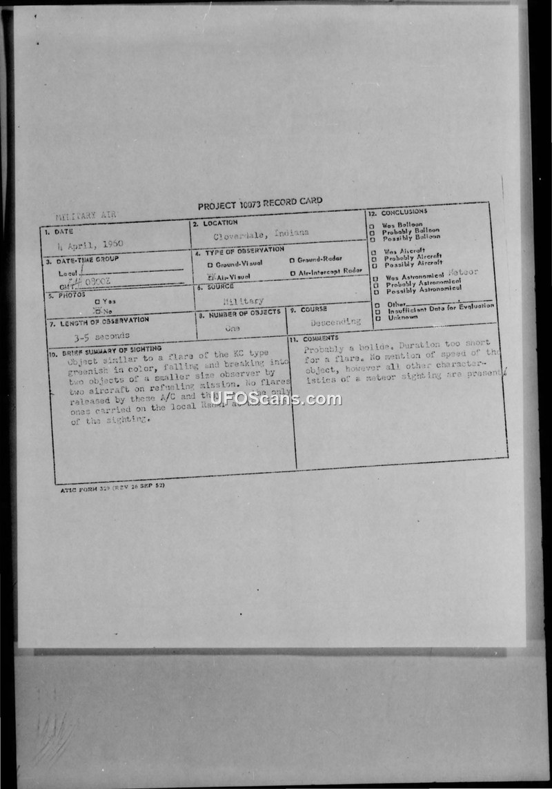 A military aircrew reported a greenish, flare-like object over Cloverdale, Indiana, on April 4, 1950. Official analysis concluded the object was likely a bolide (meteor) rather than a flare.