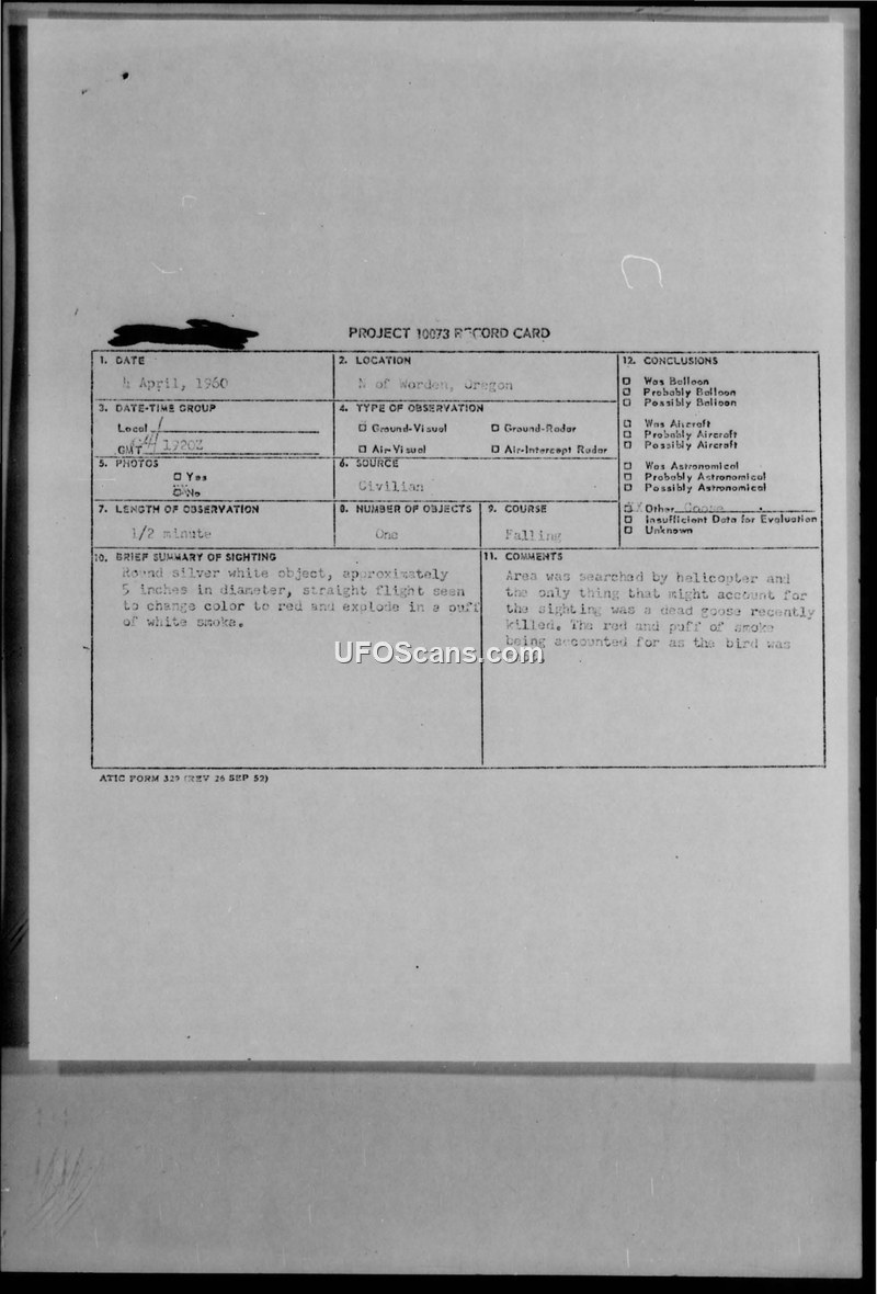 On April 4, 1960, at 1920Z, a civilian witness, identified as a farm housewife near Worden, Oregon, reported observing an unidentified aerial object. The witness described the object as a round, silver-white item, approximately five inches in diameter, which followed a straight, descending flight path. During the observation, which lasted approximately thirty seconds, the witness reported that the object changed color to red and exploded in a small puff of smoke. The report notes that a formation of four F-101 aircraft crossed in front of the witness from the direction of Kingsley Field at the time of the sighting, though the object was observed crossing the flight path below and behind the aircraft. Following the report, an investigation was conducted by the Assistant Director of Operations, Captain F. J. D'Entremont. A helicopter search of the area where the object was reported to have disappeared was conducted with negative results for any anomalous material. However, the search team discovered a large white Emperor snow goose that had been recently killed in a field immediately south of the location indicated by the observer. The investigators concluded that the goose had been shot by a poacher. They theorized that the appearance of blood accounted for the reported color change to red, and the resulting cloud of white feathers from the impact was mistaken by the observer for an explosion and a puff of smoke. The official conclusion of the report is that the sighting was explained by the death of the bird.