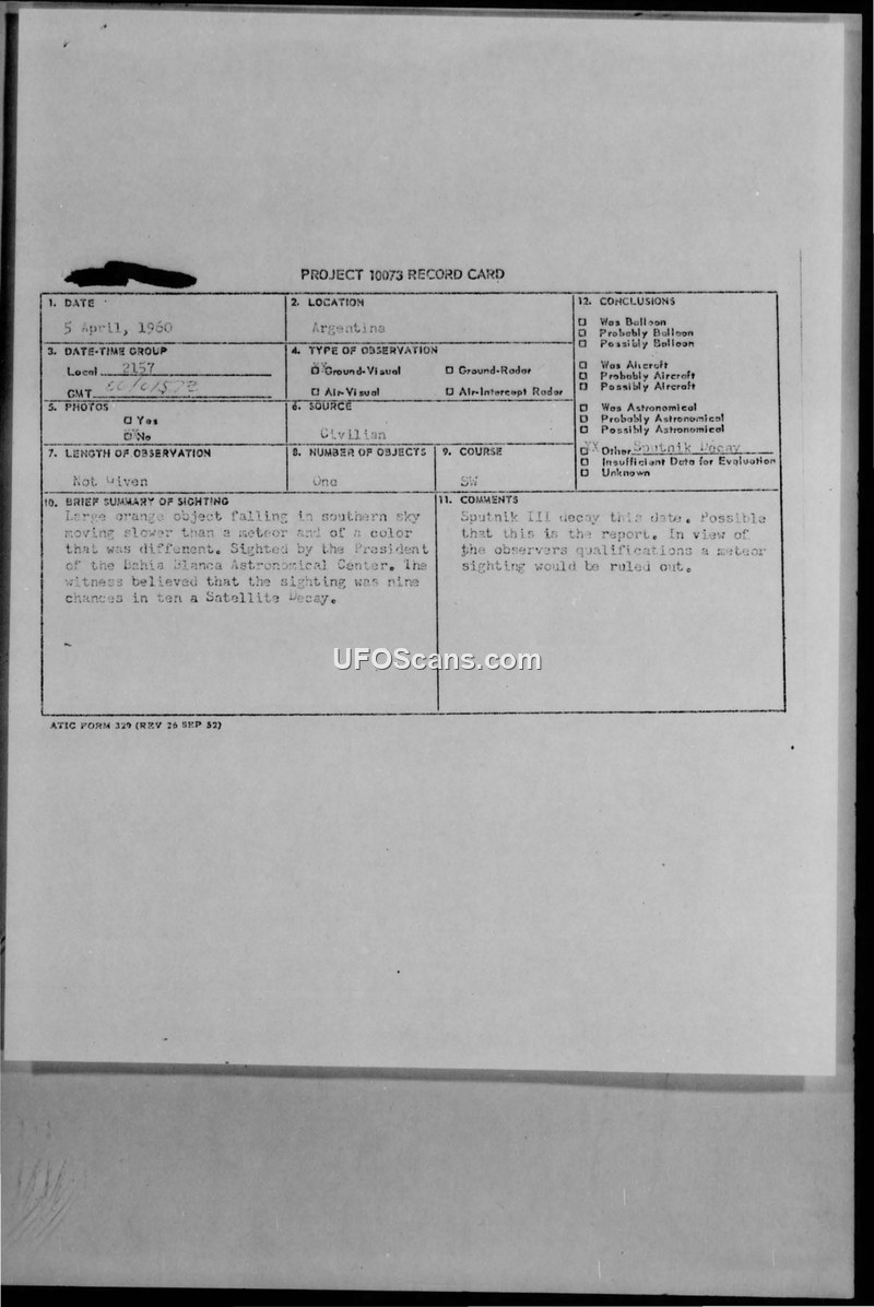 A sighting of a large orange object in Argentina on April 5, 1960, was reported by the President of the Bahia Blanca Astronomical Center. The event was officially identified by ATIC as the atmospheric decay of the Sputnik III satellite.