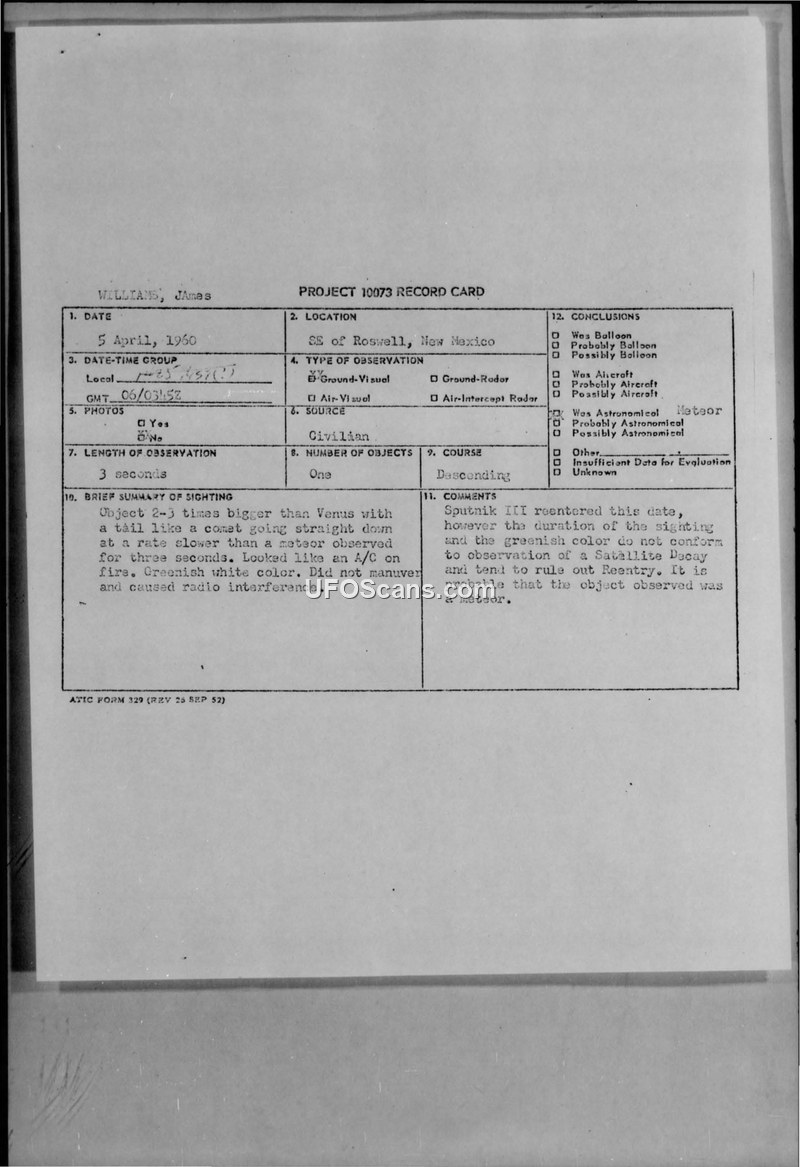 Project 10073 Record Card — Roswell, New Mexico, 5 April 1960