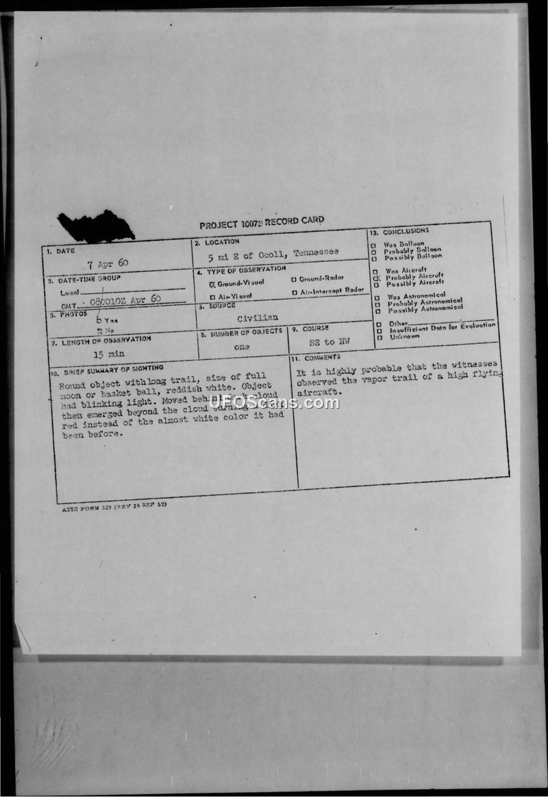 This document collection details a UFO sighting reported on April 8, 1960, near Lake Ocoee, Tennessee. The primary witness, an employee of the Chattanooga Times, observed a round, reddish-white object with a long trail, described as being the size of a full moon or a basketball held at arm's length. The object moved from the southeast to the northwest, eventually disappearing behind a cloud formation. The witness, who was with another individual, initially speculated that the object might be the Sputnik satellite, but later provided a detailed account to the Air Force. The sighting lasted approximately 15 minutes. The Air Force investigation, conducted by the 2589th Air Base Group and evaluated by the Air Technical Intelligence Center (ATIC), concluded that the witnesses had observed the vapor trail of a high-flying aircraft. The analysis suggests that the object's appearance—specifically its brightness and color change—was an optical effect caused by the aircraft being in direct sunlight at an altitude of approximately 30,000 feet, while the observers on the ground were already in twilight. The report includes official correspondence, a Project 1007 record card, and a personal letter from the witness to the operations officer at Flintstone Air Force Station. The Air Force requested additional details regarding the object's angular size and elevation to confirm their assessment. The final conclusion remained that the phenomenon was an explained event, specifically a high-altitude contrail.