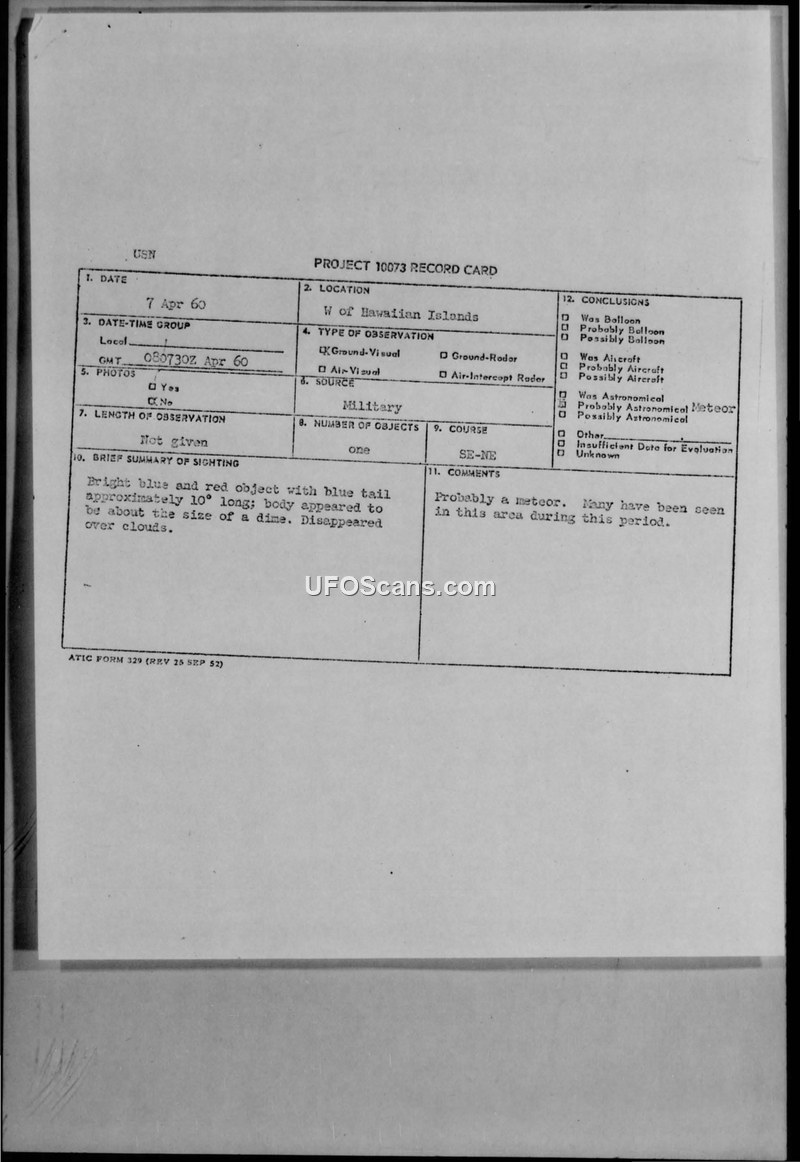 Project 10073 Record Card — Sighting West of Hawaiian Islands, 7 April 1960