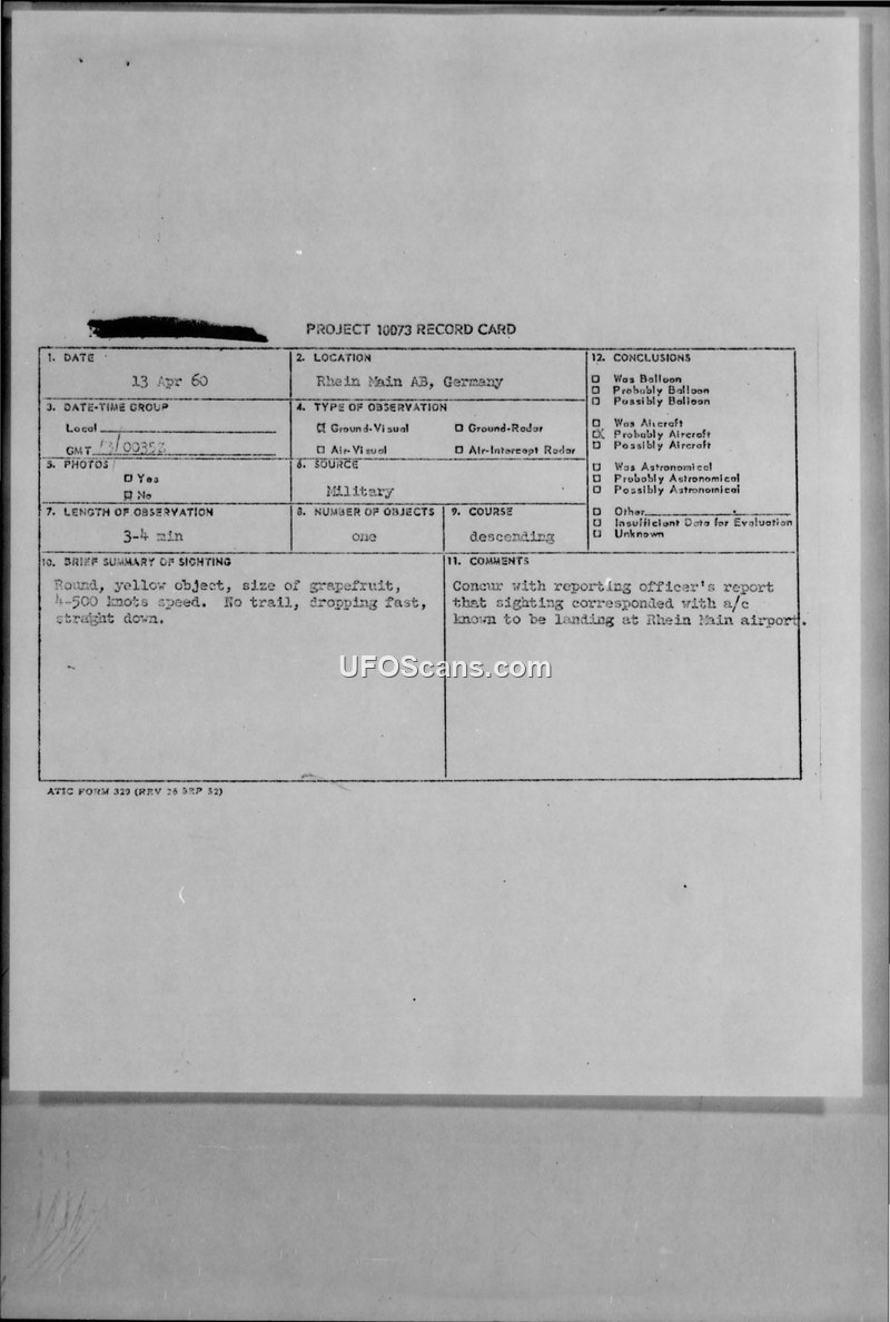 An airman reported a round, yellow object descending near Rhein Main AB on 13 April 1960. Intelligence officers concluded the object was an aircraft landing at the airport.