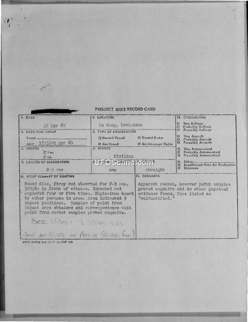 A UFO sighting in La Camp, Louisiana, on 12 April 1960 resulted in ground impact, explosions, and physical evidence including scorched vegetation and paint scrapings. Despite a thorough investigation by the 401st Tactical Fighter Wing, the object remained unidentified.