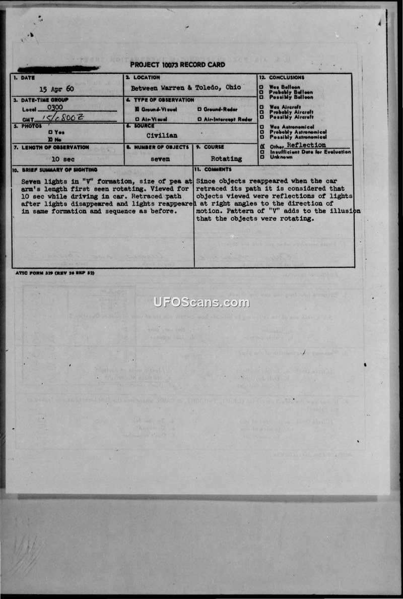 Project 10073 Record Card — Sighting near Warren & Toledo, Ohio, 15 April 1960