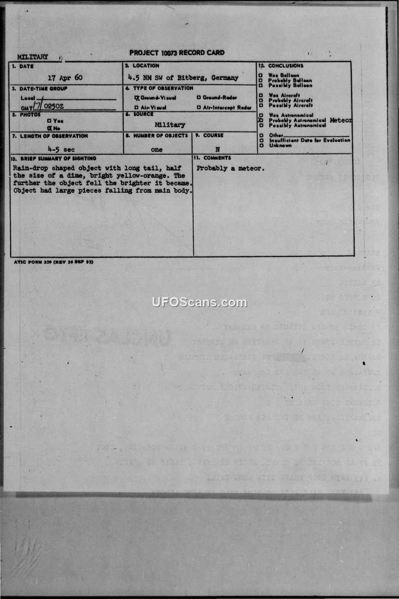 Project 10073 Record Card - Sighting near Bitburg, Germany, 17 April 1960