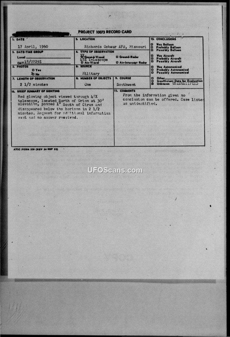 Major Jim G. Ford reported an unidentified red glowing object observed through a telescope at Richards-Gebaur AFB on 17 April 1960. The case was officially classified as unidentified after no conclusion could be reached regarding its origin.