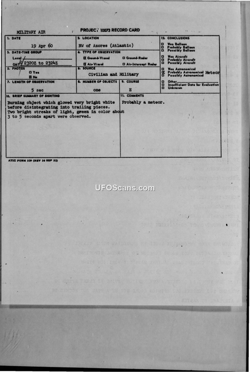 This document consists of a series of military communications and a Project 10073 record card detailing an aerial sighting that occurred on April 19, 1960, in the Atlantic Ocean, northwest of the Azores. The incident involved a burning object observed by the crew of a Norwegian motor vessel, the Luksefjell, and a US Navy WV-2 aircraft piloted by Commander Redwine of the VW-11 Squadron. The witnesses reported seeing a bright white object that disintegrated into trailing pieces, accompanied by two bright green streaks of light. The observation lasted approximately five seconds. The reports were relayed through various military channels, including the Goose NORAD Sector and the Canadian Coast Guard in Halifax. The official conclusion recorded on the Project 10073 card is that the object was 'probably a meteor.' The documentation includes various teletype messages confirming the details of the sighting, the coordinates (43-29N 37-55W), and the pilot's debrief, which noted the object was moving at great speed and crossed an arc of 45 degrees. The military authorities involved, including the Air Technical Intelligence Center (ATIC), processed the reports as a standard aerial phenomenon, ultimately dismissing the possibility of an aircraft or other artificial craft in favor of a natural celestial event.
