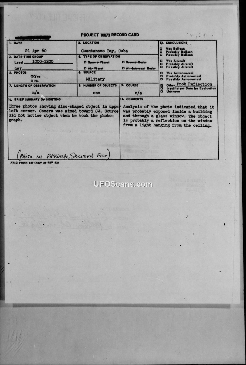 Project 10073 Record Card: Guantanamo Bay, Cuba, 21 April 1960