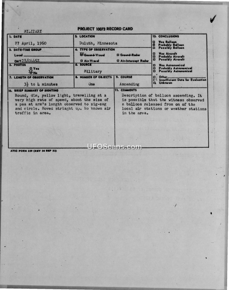 Project 10073 Record Card — Duluth, Minnesota, 27 April 1960