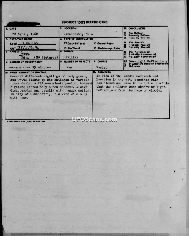 Project 10073 Record Card — Cincinnati, Ohio, 28 April 1960