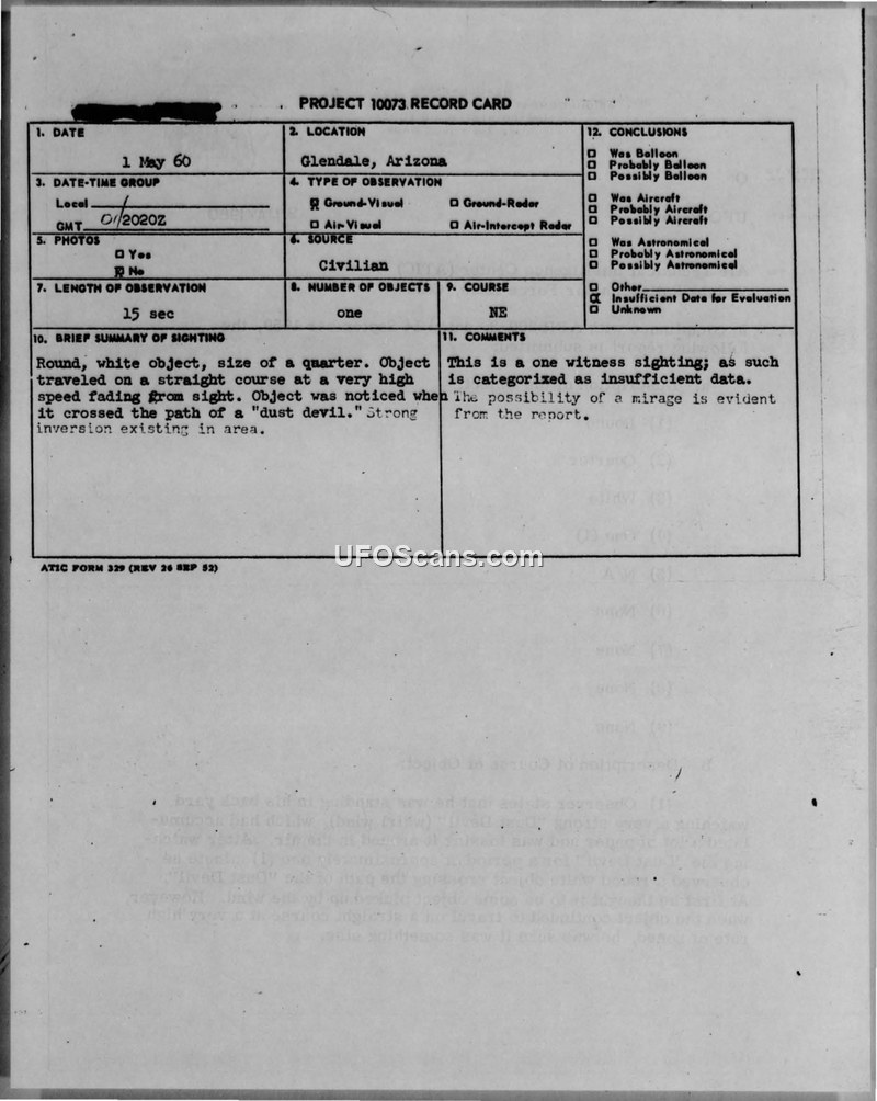 A 1960 sighting report from Glendale, Arizona, describes a round, white object observed for 15 seconds. The Air Force concluded the object was likely paper caught in a dust devil, exacerbated by atmospheric inversion.