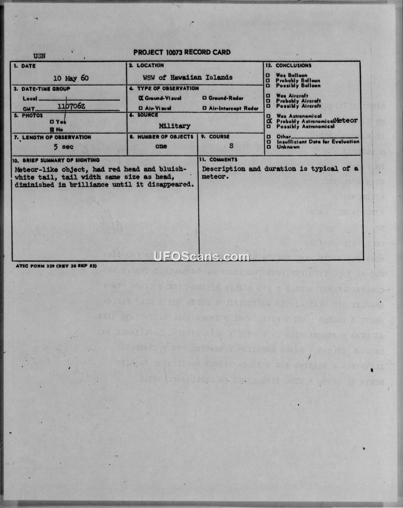 PROJECT 10073 RECORD CARD — WSW of Hawaiian Islands, 10 May 60