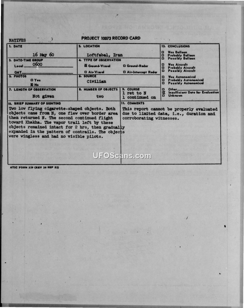 On 16 May 1960, at approximately 0600 hours, an incident occurred near the Loftfabad Border Post in Iran involving two unidentified aerial objects. According to an Air Intelligence Information Report filed by Colonel Laurence E. Horras, the Air Attache for USAirA, Iran, the objects were described as low-flying and cigarette-shaped. The report details the flight path of the objects, noting that both originated from the direction of Soviet Ashkhabad. One object flew over the border area before returning toward Ashkhabad, while the second object continued its flight toward Khakha. A significant feature of the sighting was the vapor trails left by the objects, which remained intact for two hours before gradually expanding into a pattern resembling dissipating contrails. The border commander, who witnessed the event, explicitly stated his conviction that the objects were not jet aircraft. Furthermore, the objects were reported to be wingless and devoid of any visible pilots. The source of this information was identified as the Central Intelligence Agency (CAS) and the Iranian Border Guard. The official evaluation of the sighting, recorded on a Project 10073 record card, concluded that the report could not be properly evaluated due to a lack of sufficient data, specifically citing the need for more information regarding the duration of the event and the absence of corroborating witnesses. The document also notes that the source reported no new construction in the area and that there had been no additional sightings of this nature to date. The report was later declassified in 1967 under AFR 205-1.