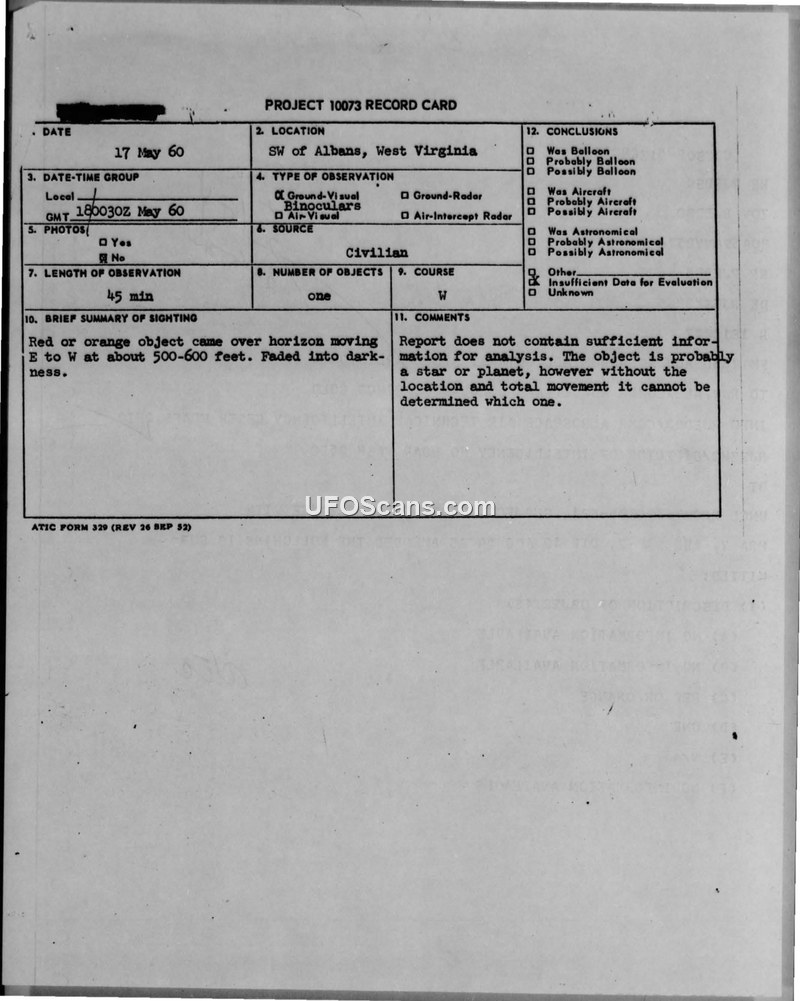 A civilian in St. Albans, West Virginia, reported a 45-minute sighting of a red or orange object on May 17, 1960. Military investigators concluded the report lacked sufficient data and likely represented a celestial body.