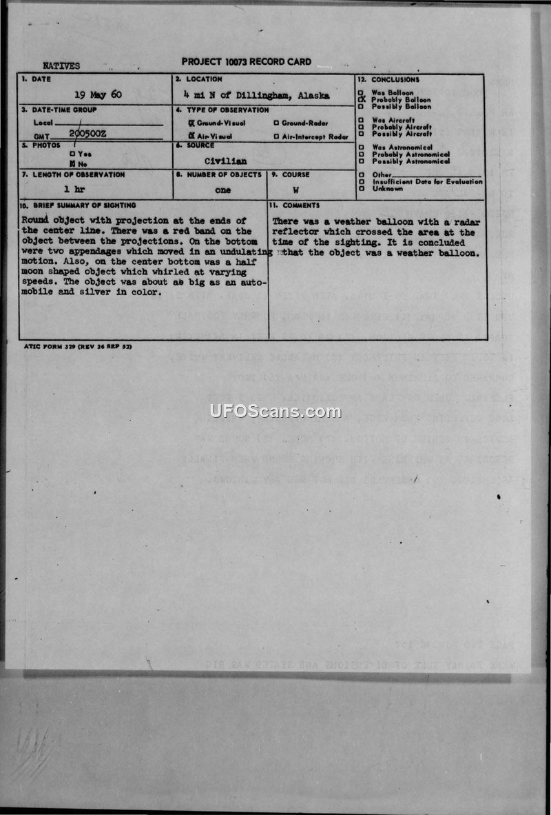 This Air Intelligence Information Report, dated June 21, 1960, details a UFO sighting that occurred on May 20, 1960, near Dillingham, Alaska. The report, authored by Captain Thomas M. Conrow of the Hq 10th Air Division (Def), serves as an amplification of previous communications regarding the incident. According to the report, a group of native observers witnessed a metallic, silver, circular object, described as football-shaped in cross-section, hovering near the ground. The object was estimated to be 20 to 25 feet in diameter and 10 to 12 feet thick. Witnesses reported that the object possessed two flexible tubes or flaps, a red band, and a semi-circular whirling device on its bottom. The object's behavior was described as moving slowly, hovering over the villages of Clarks Point and Ekuk, and then ascending rapidly to an estimated 8,000 feet. During the ascent, the object produced a whirring, sucking sound, which was powerful enough to lift dead grass and potentially a five-gallon fuel tin from the ground. The investigation involved interviews conducted by SFC Ralph Sorensen of the Alaska National Guard, who spoke to the witnesses through an interpreter. While the report acknowledges that a weather balloon was in the area at the time, the investigating officer concluded that the object was not a commonplace balloon or airplane. The report highlights that the witnesses, while difficult to assess for reliability, provided consistent accounts that were not evasive. Despite the lack of radar confirmation or physical evidence beyond the reported suction effects, the intelligence assessment maintains that there is no logical explanation for the sighting. The document includes figures illustrating the object's appearance and its flight path, and it emphasizes that the witnesses were considered accurate and reliable observers of unusual occurrences in the Alaskan area.