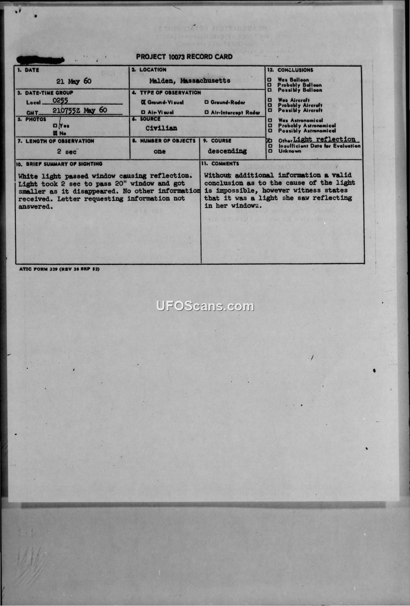 A civilian in Malden, Massachusetts, reported a brief, two-second sighting of a white light on May 21, 1960. The Air Force determined the report lacked sufficient data for a formal conclusion and requested further information from the witness.