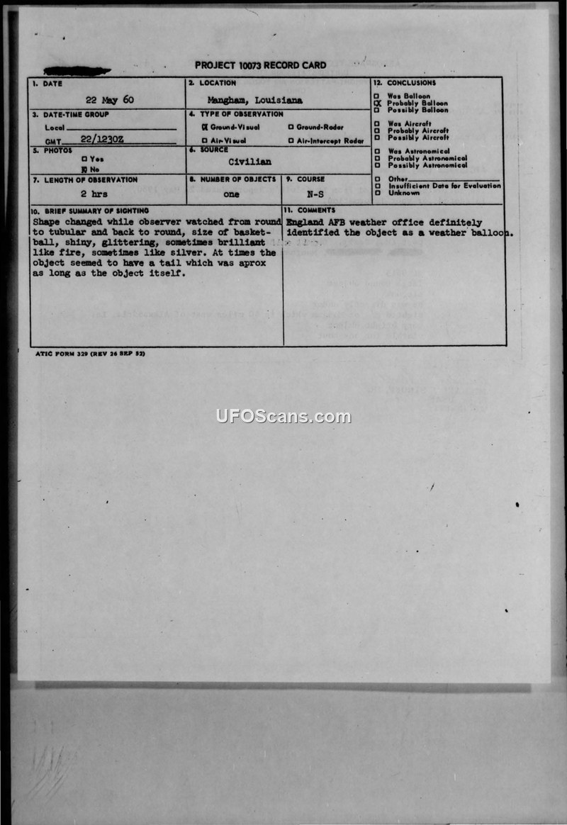 This report documents the investigation of a UFO sighting in Mangham, Louisiana, on 22 May 1960. The object was officially identified by the England AFB weather office as a weather balloon released from Natchez, Mississippi.