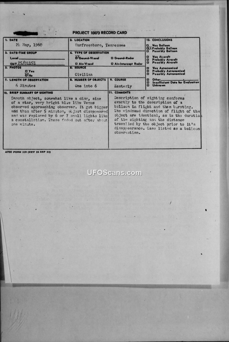 Unidentified Flying Object Report — Murfreesboro, Tennessee, 25 May 1960