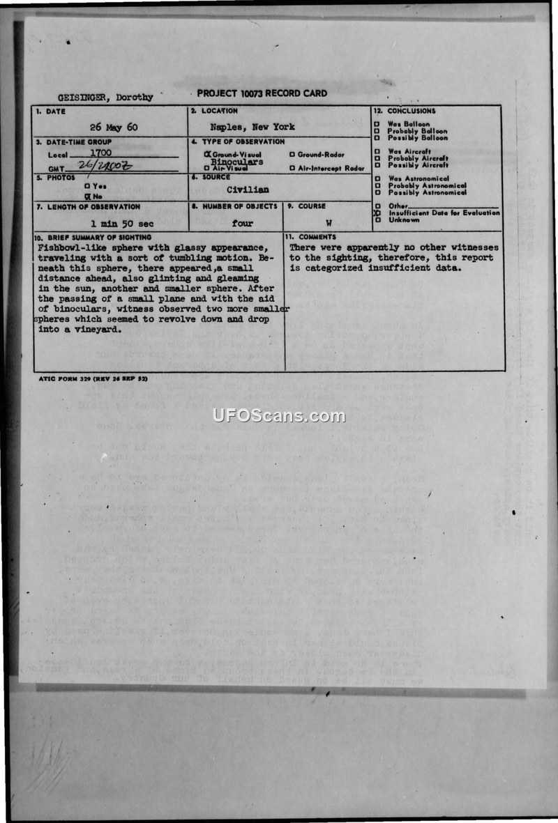 On May 26, 1960, Dorothy Geisinger of Naples, New York, reported observing four unidentified objects while sitting at her home near Naples Gorge. According to her account, she first noticed a fishbowl-like sphere with a glassy appearance moving with a tumbling motion from East to West. Beneath this object, she observed a smaller sphere. After a small plane passed over the area, she used binoculars to observe two additional smaller spheres that appeared to revolve and drop into a nearby vineyard. The witness estimated the objects were approximately the size of an orange and moving at roughly 25 miles per hour. She noted the weather was sunny with a heavy wind. Ms. Geisinger, who identified herself as a 60-year-old with a background in United Nations studies and teaching, expressed concern about the potential for these objects to be related to biological warfare or harmful insects. She also mentioned previous sightings in 1953 and 1954. The U.S. Air Force, through Lt. Col. Lawrence J. Tacker, acknowledged her report on July 1, 1960, but informed her that the information provided was insufficient for a valid conclusion. The official record card for Project 10073 ultimately categorized the incident as 'Insufficient Data for Evaluation' due to the lack of corroborating witnesses.