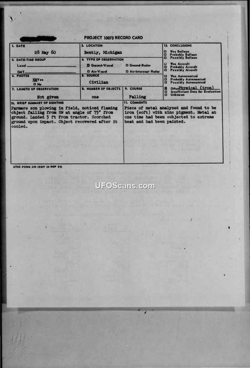 On May 28, 1960, a 16-year-old boy plowing a field near Bently, Michigan, observed a flaming object falling from a southwesterly direction at a 75-degree angle. The object landed approximately five feet from his tractor, scorching the ground upon impact. No aircraft were observed in the vicinity. The object was recovered by John Galazin after it had cooled and was subsequently turned over to the 4026th Strategic Wing at Wurtsmith Air Force Base. The object was described as a metallic, blue-black piece measuring approximately 1 1/8 by 1 inch, with a thickness varying between 1/64 and 1/16 of an inch. It exhibited signs of multiple layers or laminations and was heavily oxidized. The item was forwarded to the Aerospace Technical Intelligence Center at Wright-Patterson Air Force Base for analysis. Sam Tour & Co., Inc. conducted a metallurgical examination on behalf of New York University. Their analysis determined that the object was composed of soft iron, similar to Armco iron. Spectrographic analysis revealed the presence of iron and manganese, with traces of other elements, and identified a lead-pigmented paint on the surface. The laboratory concluded that the object had been subjected to extreme heat in an oxidizing environment, causing it to scale. The report includes photographs of the object and its microstructure. A handwritten note dated January 26, 1975, indicates that while the photographs remain in the file, the physical specimen itself is missing.