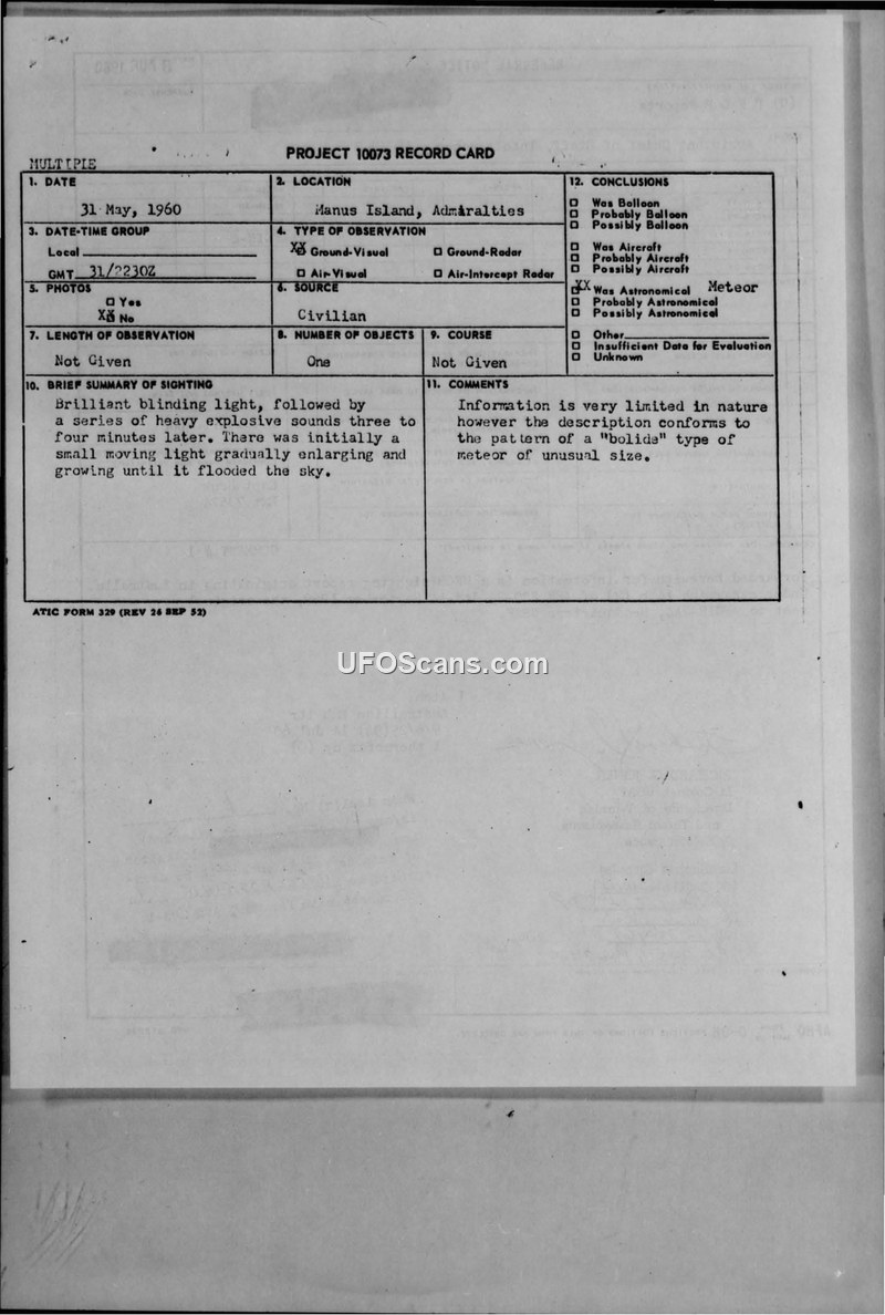 A civilian reported a brilliant light and explosive sounds over Manus Island on May 31, 1960. The USAF concluded the event was a large bolide-type meteor.
