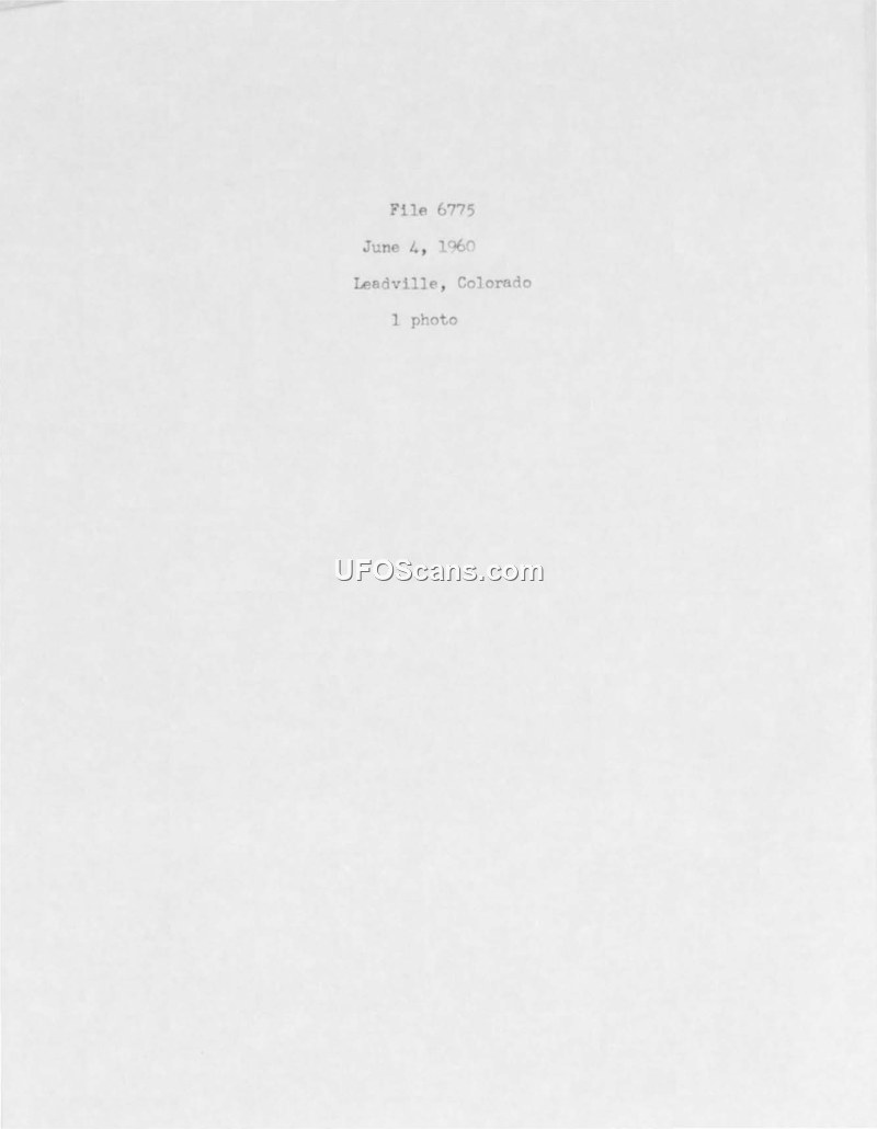 This document, identified as File 6775, serves as a record for a sighting incident that occurred on June 4, 1960, in Leadville, Colorado. The file consists of two pages: a cover sheet containing the date, location, and a reference to an included photograph, and the photograph itself. The photograph depicts a landscape scene featuring a body of water in the foreground, with mountains in the distance under a sky containing clouds and a distinct, bright, elongated aerial phenomenon. The document provides no narrative description, witness testimony, or official analysis regarding the nature of the object captured in the image. It functions strictly as an archival record linking a specific case number to a visual piece of evidence.
