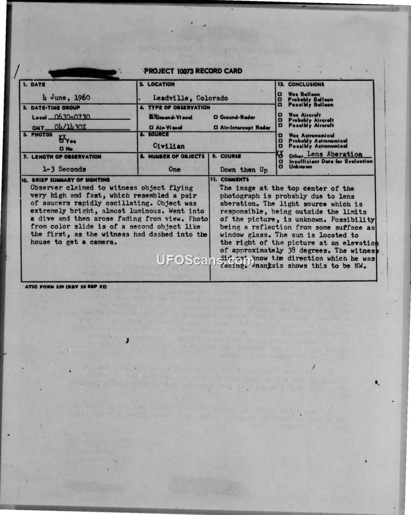This document file details the investigation of a UFO sighting reported by a Canadian tourist in Leadville, Colorado, on June 4, 1960. The witness, who was on holiday, captured a color slide of an object he described as extremely bright, luminous, and resembling a pair of oscillating saucers. He reported that the object performed a dive and then climbed rapidly, disappearing from view within 1-3 seconds. The witness later obtained his camera to photograph a second, similar object. The report includes a Project 10073 record card and extensive correspondence between the Aerospace Technical Intelligence Center (ATIC) at Wright-Patterson Air Force Base and the US Air Attache in Ottawa, Canada. ATIC requested detailed information from the witness, including camera settings, the direction of the camera, and whether the photo was taken through a window. The witness provided technical details, noting he used a Zeiss Contessa camera with a 1/500 shutter speed and that the photo was not taken through a window. ATIC analysts performed a rigorous evaluation of the photographic evidence. They calculated that if the object were 10 miles away, it would have been traveling at 7,200,000 knots, which they deemed physically impossible. They noted that the trail visible on the photograph was not visible to the naked eye and that the camera appeared to be level with the horizon rather than pointed at the object. The final ATIC conclusion was that the object was likely a lenticular cloud and that the streaks on the photograph were likely caused by imperfections on a window pane, despite the witness's claim that the photo was not taken through glass. The file concludes with a request for the return of the slide and a final assessment from the Photo Analysis Branch suggesting that future sightings should be evaluated by them before additional information is requested from the source to ensure proper context regarding the conditions of the photography.