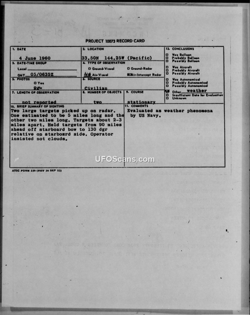 On June 4, 1960, at 0635Z, two large, stationary radar contacts were detected at 33.50N 144.25W in the Pacific region. The targets were observed at an altitude of 31,000 feet. One target was estimated to be five miles long, while the other was two miles long, with the two objects positioned approximately two to three miles apart. The radar operator noted that the objects were not round, but appeared approximately two ship-widths wide. The targets were tracked from 90 miles ahead off the starboard bow to 130 degrees relative to the starboard side. Despite the radar operator's insistence that the contacts were not clouds, the US Navy evaluated the incident as weather phenomena. Subsequent reports from flights passing through the target area indicated no unusual radar activity, and the incident was officially classified as posing no threat.