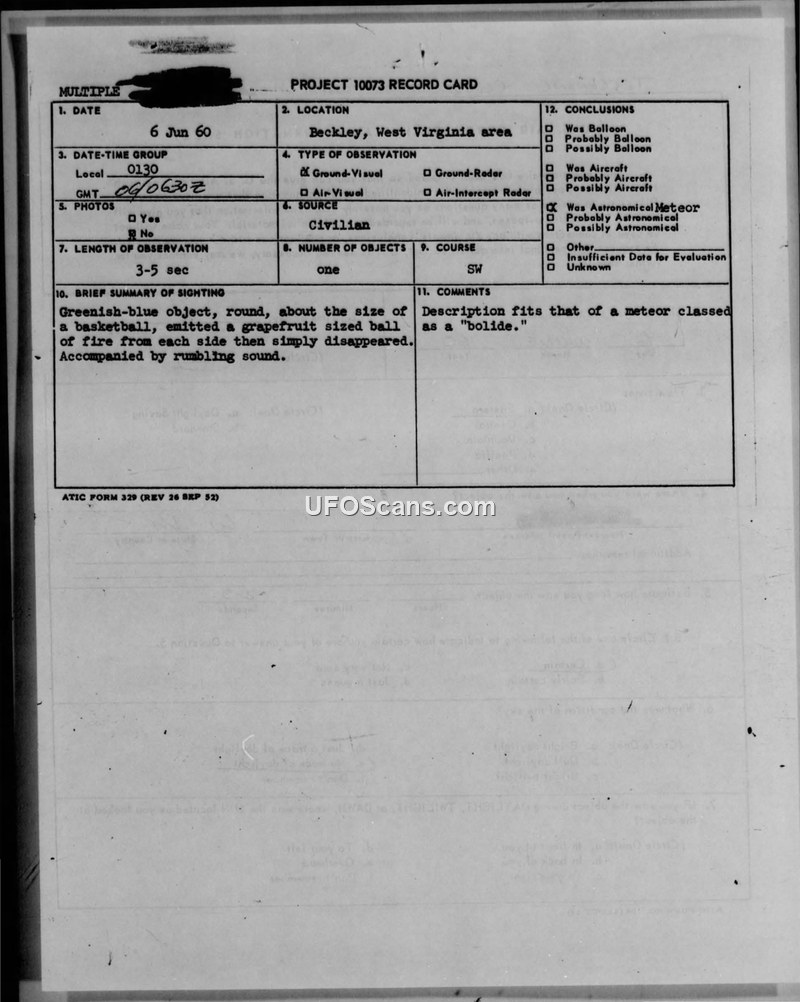 On June 6, 1960, witnesses in Beckley, West Virginia, observed a greenish-blue, basketball-sized object that emitted fire and made a rumbling sound. The Air Force investigated the incident and concluded the object was a meteor, specifically a bolide.