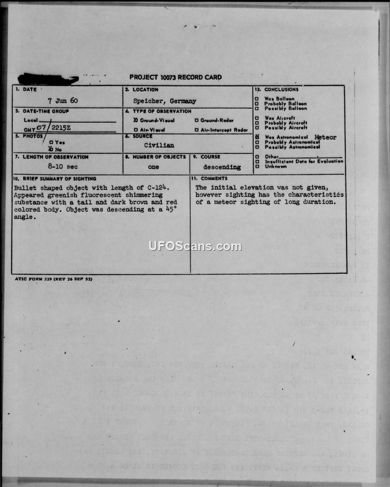 Project 10073 Record Card and UFO Report — Speicher, Germany, 7 June 1960