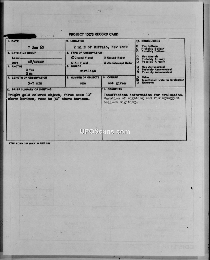 A civilian reported a bright gold object rising in the sky near Buffalo, New York, on June 7, 1960. The Air Force concluded there was insufficient data for identification, though it likely resembled a balloon.