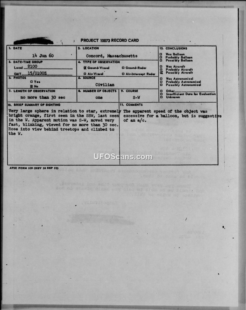 Project 10073 Record Card — Concord, Massachusetts, 14 June 1960