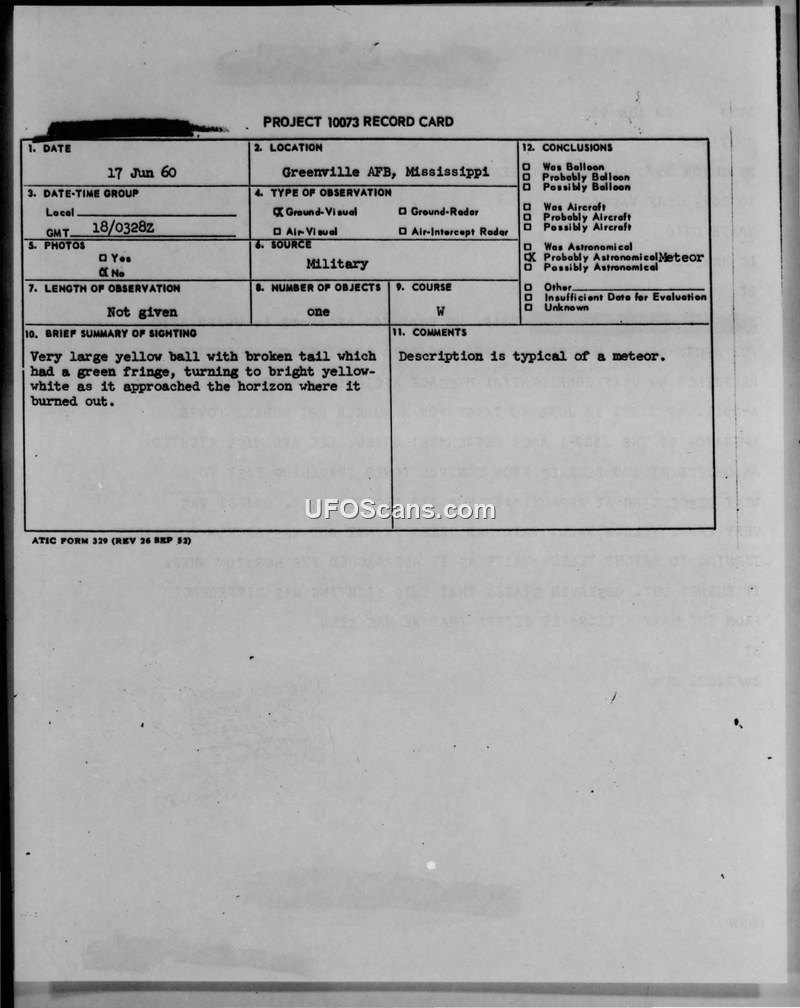 On June 18, 1960, at 0328Z, T/Sgt Roy H. Wubker, a tower operator with the 2022-1 AACS Detachment at Greenville AFB, Mississippi, observed an unidentified aerial object. The object was described as a very large yellow ball with a broken tail featuring a green fringe. As the object traveled from east to west, descending at an angle of approximately 075 degrees, it shifted to a bright yellow-white color before burning out as it approached the horizon. The incident was formally reported by the Commander of the 3505 PLT THGWG to the Chief of Staff of the USAF, WPAFB, and LG Hanscom Field. The report was cross-referenced with Project Space Track and Project Moondust. Despite the observer's assertion that the object appeared different from the many meteors he had previously witnessed, the official conclusion recorded on the Project 10073 record card is that the description is typical of a meteor.