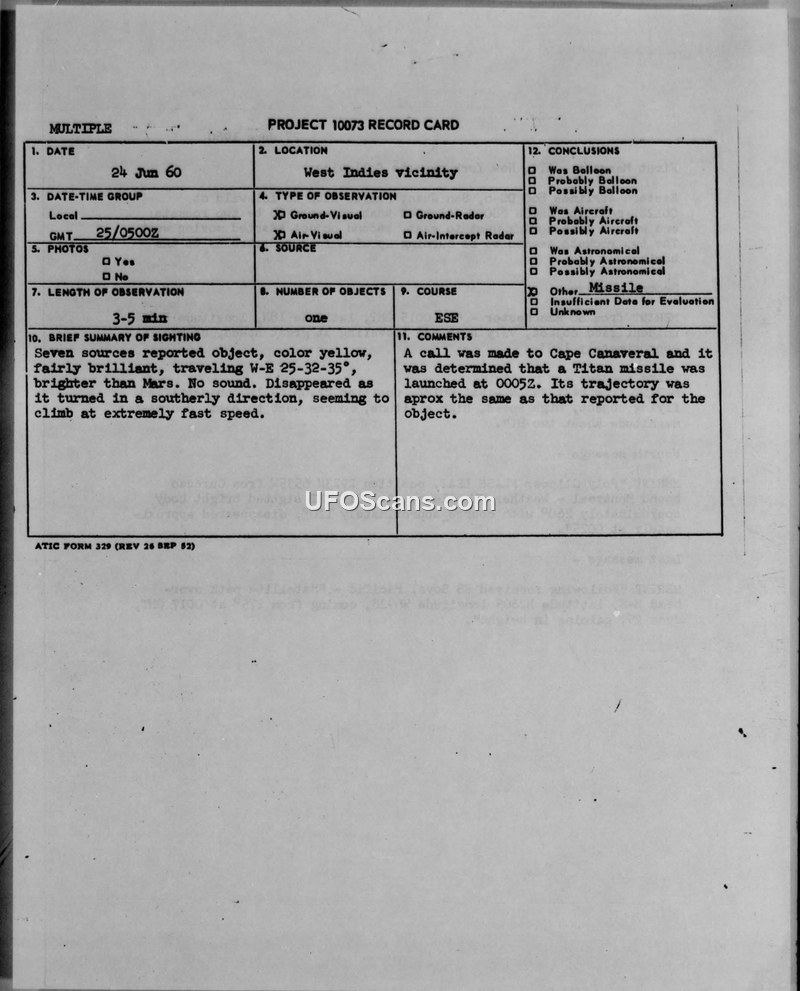 A sighting of an unidentified object in the West Indies on June 25, 1960, was investigated by ATIC. The object was officially identified as a Titan missile launched from Cape Canaveral.