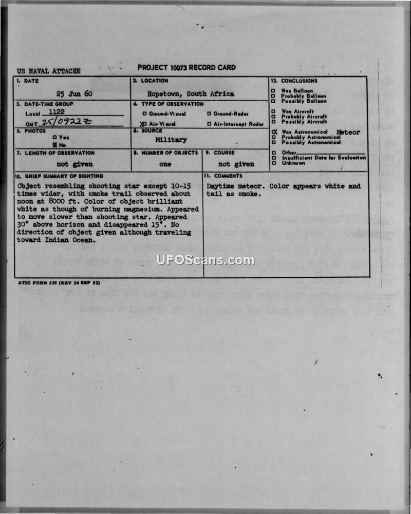 A sighting of a brilliant white object with a smoke trail over Hopetown, South Africa, on June 25, 1960, was officially identified by ATIC as a daytime meteor.