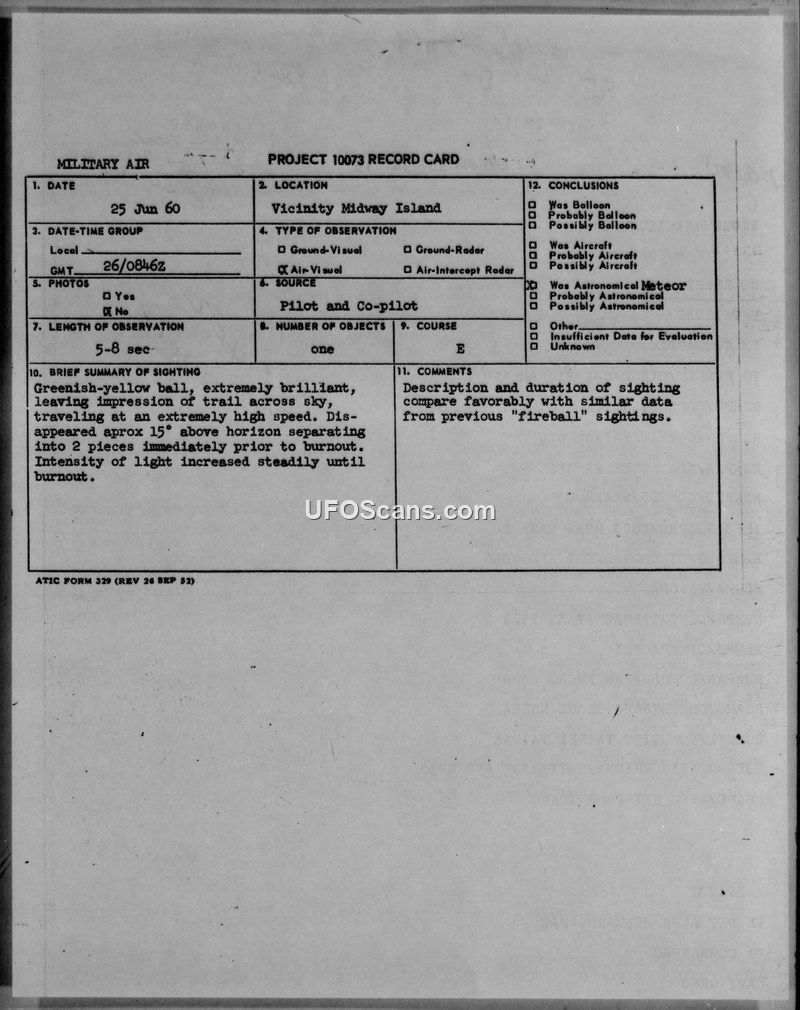 A 1960 CIRVIS report details a pilot and co-pilot's observation of a brilliant greenish-yellow fireball near Midway Island. The object was officially classified by ATIC as an astronomical meteor.