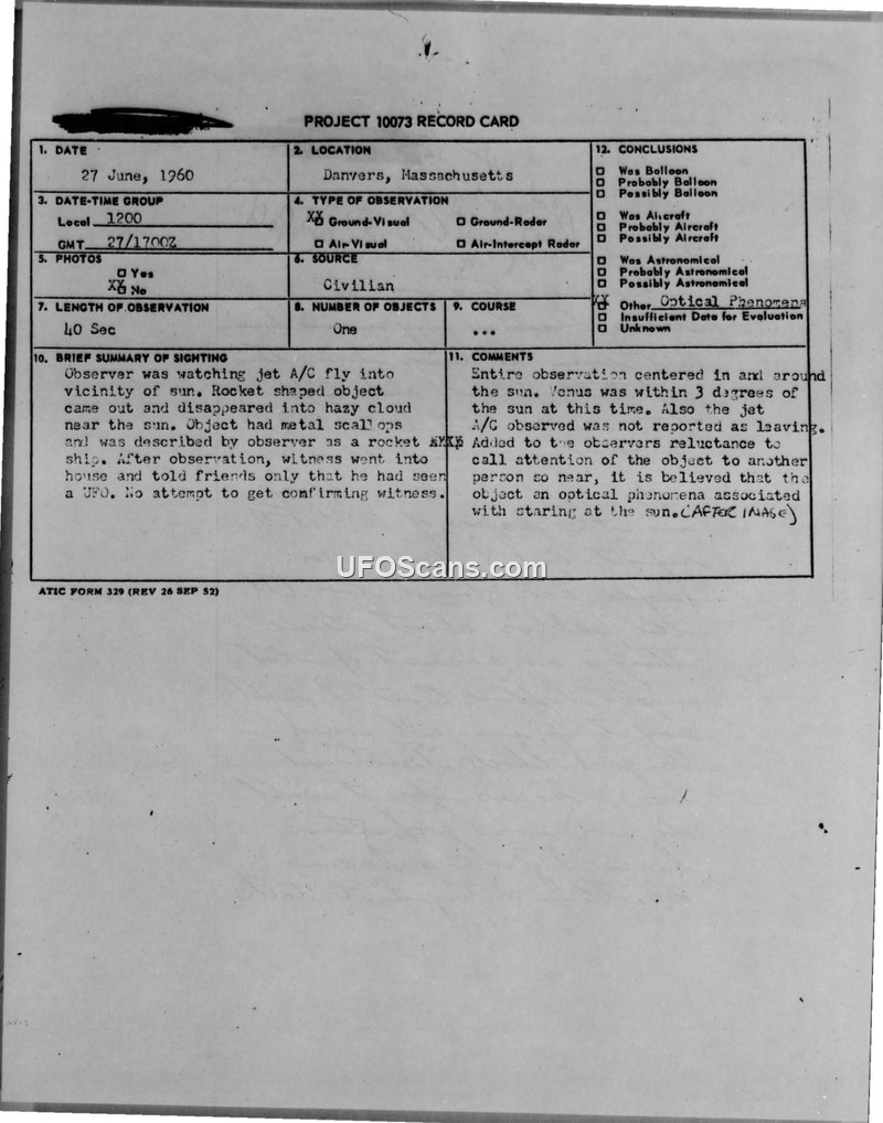 A civilian in Danvers, Massachusetts, reported a rocket-shaped metallic object near the sun on June 27, 1960. The Air Force concluded the sighting was likely an optical afterimage caused by staring at the sun.