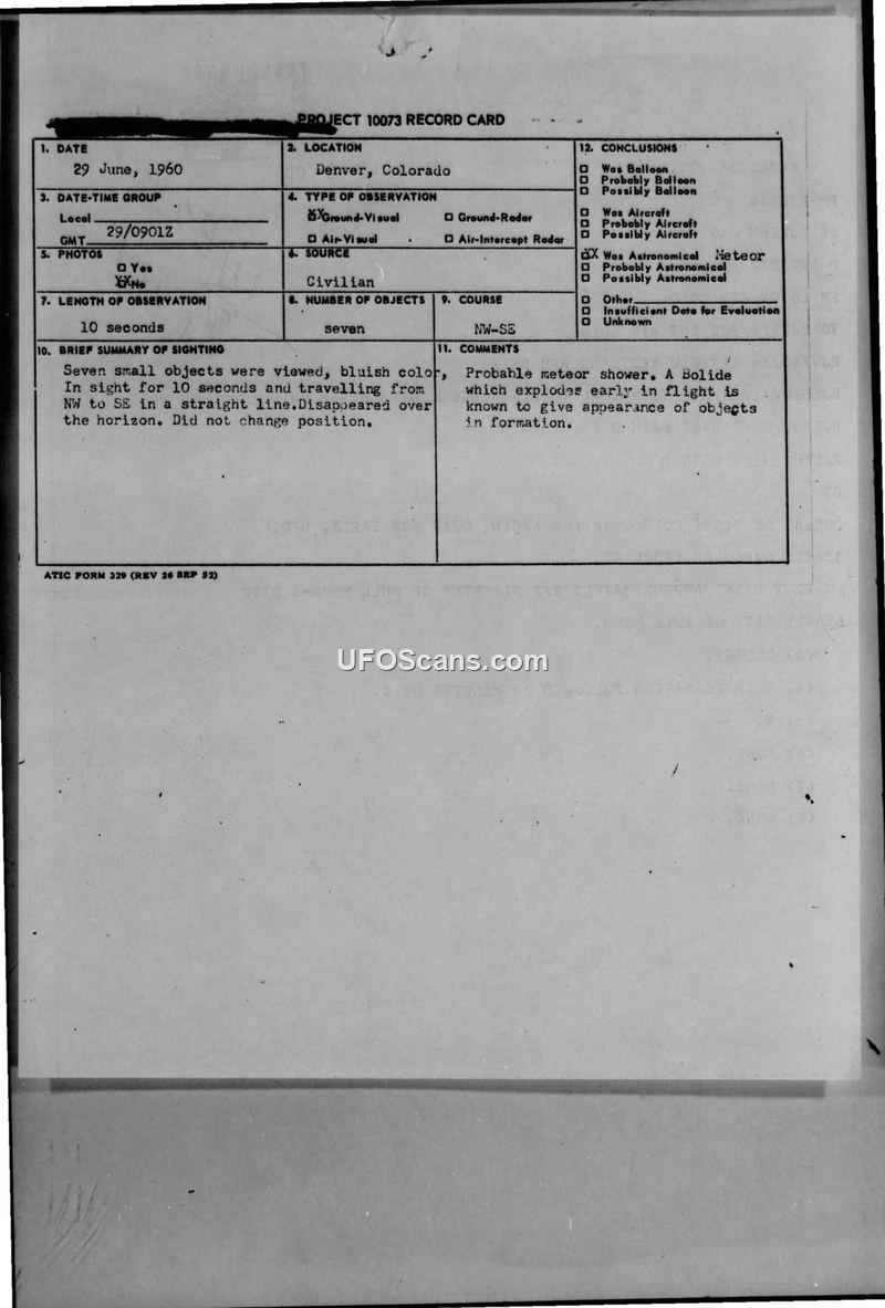 Project 10073 Record Card — Denver, Colorado, 29 June 1960
