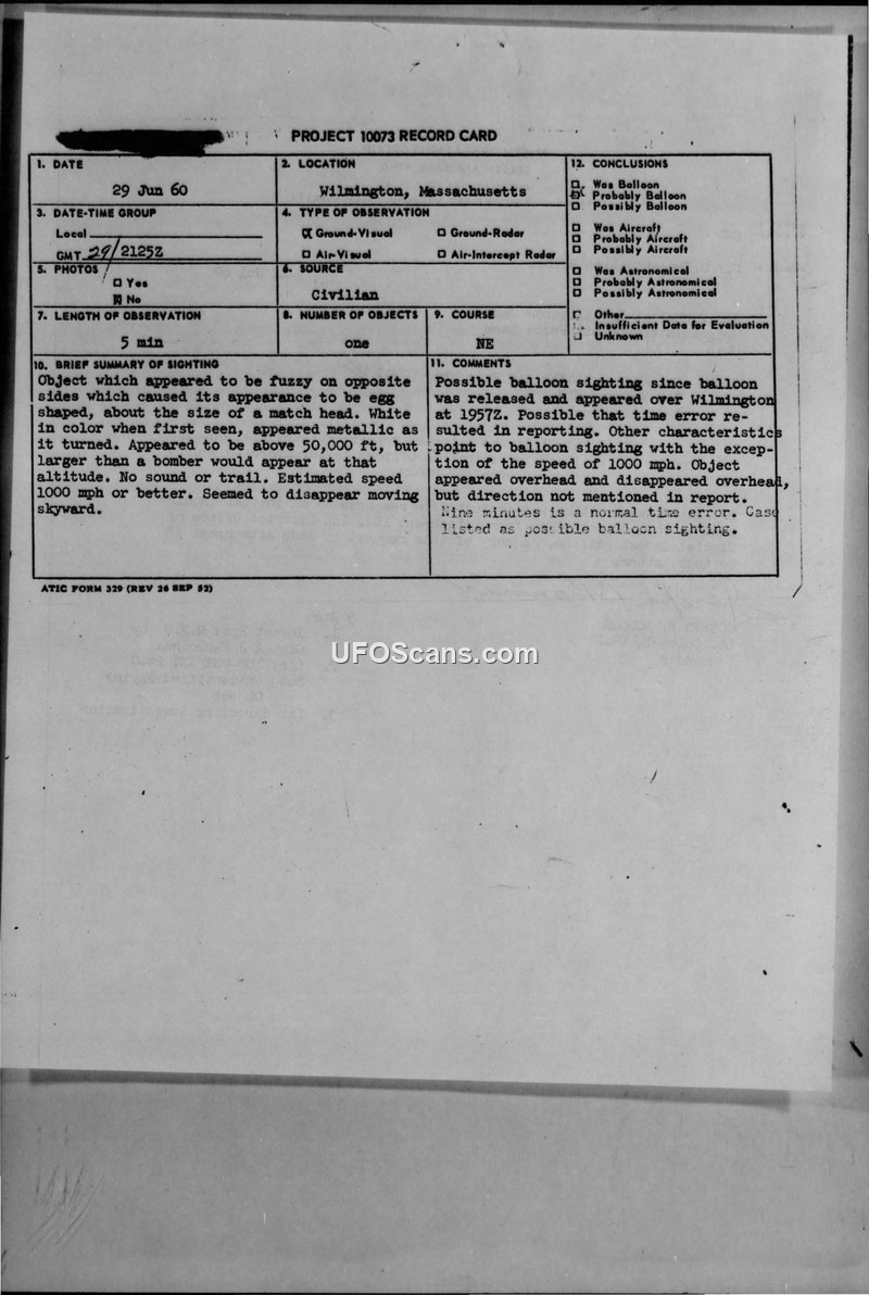A 38-year-old civilian reported an egg-shaped, high-altitude object moving at 1,000 mph over Wilmington, Massachusetts, on 29 June 1960. Despite thorough investigation by the Air Force, including radar checks and the elimination of a local weather balloon, the object remained unidentified.