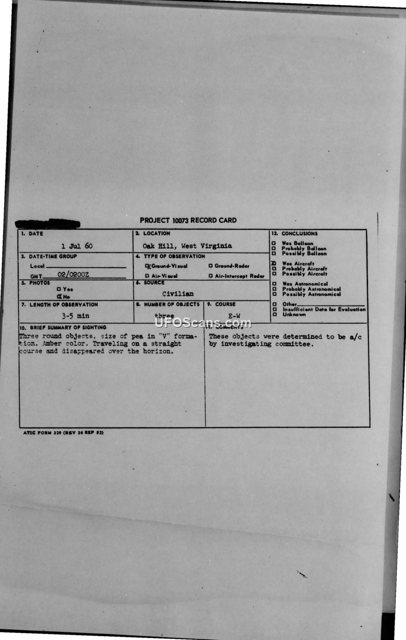 On 1 July 1960, three amber objects in a V-formation were sighted over Oak Hill, West Virginia. The Air Force investigated the incident and concluded the objects were a flight of three aircraft.