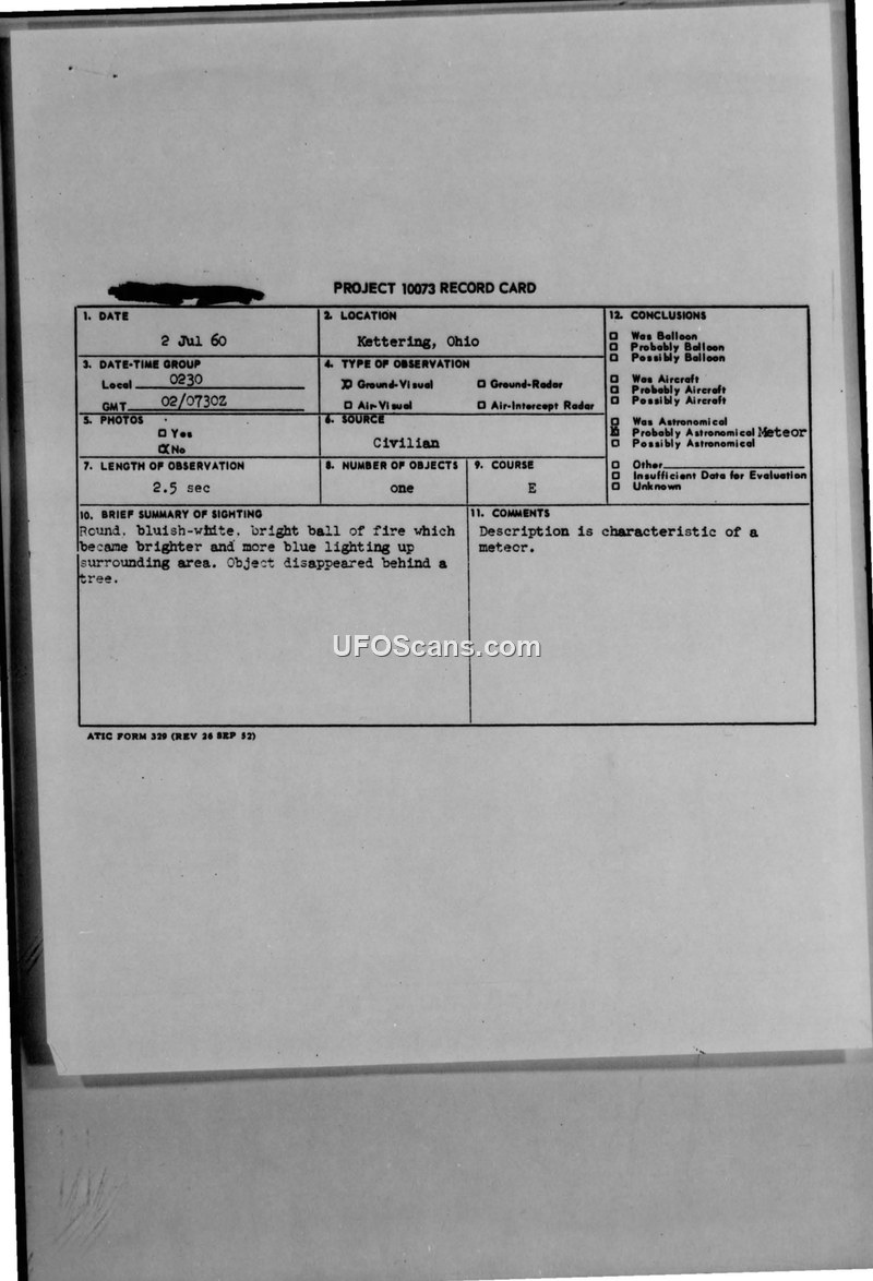 Project 10073 Record Card — Kettering, Ohio, 2 July 1960