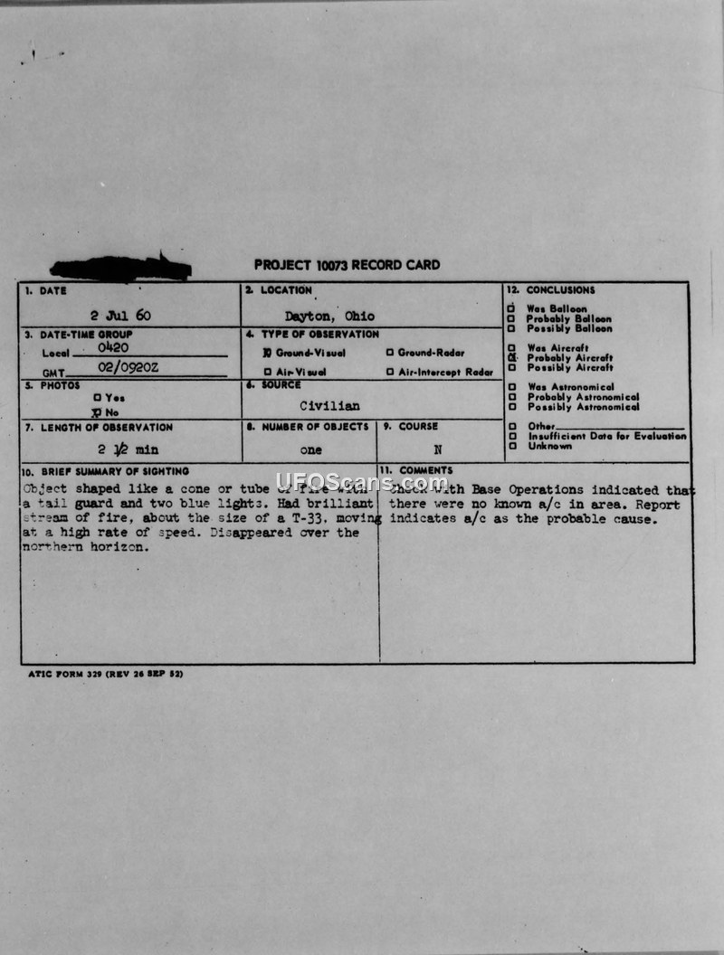This document is a collection of Project 10073 record cards and U.S. Air Force Technical Information Sheets detailing multiple Unidentified Aerial Phenomena (UAP) sightings reported in the Dayton, Ohio area during July 1960. The reports document various civilian observations, including a cone-shaped object with a tail of fire, a star-like object with flashing red lights, and a green object with an orange halo. For the July 2, 1960, sighting, the witness described a cone or tube of fire, approximately the size of a T-33 aircraft, moving at a high rate of speed. Despite a check with Base Operations confirming no known aircraft in the area, the official conclusion suggested an aircraft as the probable cause. A subsequent sighting on July 14, 1960, involved an object with swept-back wings and a flashing red light, which was also attributed to a jet aircraft. A third report from July 21, 1960, described a green object with an orange halo, which was officially categorized as a typical meteor observation. The documentation includes correspondence from the Aerospace Technical Intelligence Center (ATIC) at Wright-Patterson Air Force Base, specifically an extract from a Duty Officer's report regarding the July 2nd incident. The records highlight the Air Force's systematic approach to gathering data through standardized questionnaires, which requested details on the object's appearance, speed, altitude, and the witness's personal information. The documents reflect the ongoing efforts of the Air Force to investigate and categorize aerial phenomena reported by the public during this period, often seeking conventional explanations such as aircraft or astronomical events.